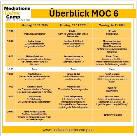 Hier findest Du unsere Übersicht aller 20 Slots mit unseren aktuell wunderbaren 18 Referent*innen. (Achtung: Dieser Überblick aktualisiert sich regelmäßig. Dieser hier stellt den aktuellen Stand dar):